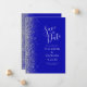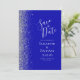 Det moderna bröllop spara datum-kortet från elegantens lämnat kant har ett silver faux glitter gräns. Anpassadet kombinerar vit handskrift, tryckplåt och kursiv typsnitt på royalets blå bakgrund. Den omvända sidan har en matchande design i blått och silver.