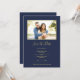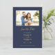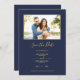 Skapa ett bestående intryck med detta sofistikerade Spara datumkortet, med en rikens mörk blått bakgrund och elegant guld-fotot ram som på ett snyggt sätt visar en personlig bild. Utformningen kombinerar chic traditionellt inslag med modern elegans, som framhävs av en elegant, handskriven kalligrafi i stil som ger dig en förfinad beröring till dina bröllop-detaljer. Det här tidslösa kortet fångar söta lycklig-stunder samtidigt som gästerna är väl förberedda för speciella firande, med de lyxiga guld-accenterna tryckta för ytterligare sofistikering.