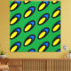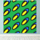 Den här färgstarka, abstrakta designen med insida har stora, ljusblå ovaler, som skisseras svart, som springa diagonalt tvärs över i designen. Mindre ovalformade gulter av citron vilar inuti var och en. Generöst böjt linjer i den sammansättning där färg och formen uppfyller den vibrerande gröntens bakgrund.