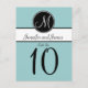 Elegant: Blå svarta vita monogram Bröllop Bordsnummer-kort. Elke Clarke © Dessa vykort för Bordsnummer i bröllop visas med ljusblå bakgrund, vit monogram inledningsvis på en märkre med svart cirkel och brud och groom namn på svart och vitt rand. Anpassa med brid och groom namn, inledande monogram, bordsnummer och bröllop färg med hjälp av Zazzles instruktioner för enkel använda. Denna enkla, men ändå elegant, monogramdesign fungerar för hela brev i alfabetet och är helt och hållet anpassade till alla kombinationer av färg till kostym. Beställ ett kort för varje bordsnummer. Du ändrar det till varje nummer och lägger sedan till i kundvagnen.
