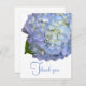Flat tackkort-kort för vattenblomma. Ljusblå vattenfri blomning med lite grön bakgrund på vit bakgrund med blå text "tack". Omvänd är tomt, vitt för att ett personligt meddelande ska kunna skrivas för hand. Välj en storlek som fungerar med den här blommigten och uppgradera pappra som du vill.