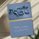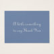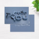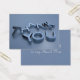 Storleka visitkort som säger "Tack" i 3D-silvret på ena sidan och på den andra sidan kan du skriva ett eget meddelande på den blå färgadens bakgrund.