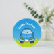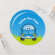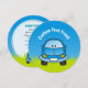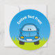 En blå bil med tecknad över grönt gräs under blå himmel.