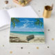 Gästboken i bröllop med ett foto av en vacker tropisk sandstrand med handflatan träd, en liten båt, och oceanen vatten som hamnar på stranden. Himlar är ett ljust royal blått. Brödens och brudgummens namn är på framsidan och ryggraden tillsammans med deras datum i bröllop. Perfekt till stranden eller destinationsbröllopet.