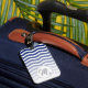 Snyggtens bagagetapp med blå vågigt mönster och elegant som första påskrift.