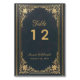 Det blå bordsnumret i elegant bröllop, med vintage luft, har en vintage av gyllene ram med baroque guld dekorationer på marin blå bakgrund. Namn och titeln Bord skrivs i ett kalligrafiskt skript för elegant. All text kan vara personlig och ha ett gyllene färg som liknar dekorationerna i ram guld. Bakgrunden med dekorationerna i elegant guld på mörk blått kommer från en vintage Fransk bok-täckmantel, av Georges Mercier (1885-1939) - Madame de Maupin av Teophile Gautier, volym 1, utgåva 1911, Paris - Paris nu offentligt, från New York Public Bibliotek