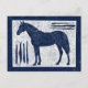 En marin blå häst över en vit bakgrund med marinblå ram och abstrakt linjer. Woodblock, linocut stil.