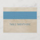 Elegant och chic Rustic Damask Wedding Bordsnummer Postcard med en vintage texturerad papper utseende och ett blomstrande dammliknande mönster gräns i blått. Enkel att anpassa, lägg helt enkelt till rätt bordsnummer i den text fält tillhandahåller. Klicka på Anpassa om du vill söka efter fler anpassningsalternativ.