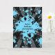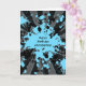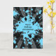 Gulligt måla kortet för splatterfödelsedaghälsningen med blått, och svarten målar splatters på en grungy grått, svärtar och slösar sunbursten mönstrad bakgrund.