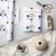 Slå in papper med en gullig stick figurhejaklacksledare i en vit och en blått som är enhetliga med blåttpompoms.