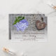 Blått hydrangea och metalliskt rostat hjärta med monogram på trädammduschinbjudan från bröllop par, som visar ett brunt, pålitligt metallhjärta med initialer inkapslat på den avvanda grått-lingskivan och en blå vattenblomma. Denna utformning av en blommigt bröllop-mall med monogrammet är helt och hållet anpassade och perfekt för en vår eller sommar-land-bröllop.