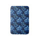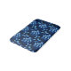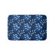 Blått badmatt med botaniskt mönster tillverkat av en söt vektor som illustrerar blommigtens motiv på en växt med blå löv och vit vävnad på dem, placerat över lätt genomskinligt mönster av samma platta över mörk blått bakgrund.