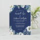 Våldsamma marinblått och vit blommigt kvällsinbjudan till ett modernt vinterbröllop. En elegant botanisk spray av grönt löv dyker upp ovanför ett handskrivet, vitt skript för ett fantastiskt modernt inbjudan.