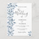 En bröllopsinbjudan till trendiget i vitt och dammblått. En vit chic på framsidan. Dekorerad med botaniska blåa färgader och löv. Modern stor, hanterad text, typografi med texten: bröllop i. Mallar för första namn och bröllop. Mörk grått text. Baksida: dammig blå bakgrund. Tips! Om du inte vill att det ska se ut som ett vykort klickar du på anpassa, går till baksidan och tar bort delaren och lägger till frimärke.