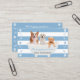 Ett sött affärskort för hund och djuromsorg service. På en dammig blå och vit rand-bakgrund består utformningen av ett bubbelbad som innehåller tre vidsträckta hundar. Kortets sidor är dekorerade med mönster i hund, sax och gromingkammar. Badbadet är märkt med ditt namn eller ditt företag namn, följt av hund grooming. Anpassa genom att lägga till din fullt- och kontaktinformation på baksidan.