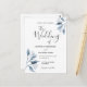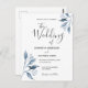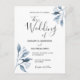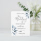 En enkel bröllopsinbjudan från trendiget i vitt, silver blå och klassisk blått. En vit chic på framsidan. Dekorerad med botaniskt silver blå färgad grenar och löv. Modern stor, hanterad text, typografi med texten: bröllop i. Mallar för namn och bröllop. Mörk grått text. Bakåt: vit bakgrund. Tips! Om du inte vill att det ska se ut som ett vykort klickar du på anpassa, går till baksidan och tar bort delaren och lägger till frimärke.