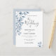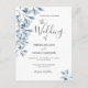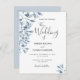 En bröllopsinbjudan till trendiget i vitt och dammblått. En vit chic på framsidan. Dekorerad med botaniska blåa färgader och löv. Modern stor, hanterad text, typografi med texten: bröllop i. Mallar för namn och bröllop. Mörk grått text. Baksida: dammig blå bakgrund. Tips! Om du inte vill att det ska se ut som ett vykort klickar du på anpassa, går till baksidan och tar bort delaren och lägger till frimärke.