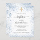 En modern, elegant baptism, som firar ett pojke. Vit bakgrund med blå faux glitter-damm och gyllene kor. Anpassa och lägg till information om namn och party. Svart färgad brev.