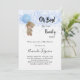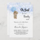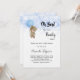 För en babydusch som firar en pojke. En vit bakgrund. En nalle med blå ballong. Anpassa och lägg till närmare uppgifter om namn i mamma och party. Namn och texten: Oj, och Barly är skrivna med ett handskript i stil.