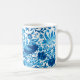 Mugg i en William Morris, Art nouveau tapestry mönster med titeln "The Strawberry Thief", av stiliserade fåglar, blommor, jordgubbar och löv, digitalt förstärkta och färgad i nyanser och koboltblått, på vit bakgrund