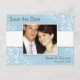 Lägg till ett eget foto i vår anpassningsbar Spara vykorten Datum med elegantens ljusblå blommigt-snurra utformning. Mall som är enkel att använda - lägg bara till ditt foto och ange namn på Bride & Groom, tillsammans med bröllop-datumet i det utrymme som ges.