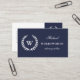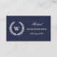 Klassiskt, vitt lagerkrans monogram på mörk blått, vitt eget namn och yrke på framsidan, blå kontaktinformation på baksidan. Ser elegant, imponerande och dyr ut. Lämpligt för många professioneller (advokat används som exempel).