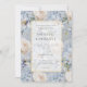 Den här designen har ett vackert, mjukt, blått och vitt, rustiskt blommönster på en dammig, periwinkle blue åldras-bakgrund. Texten visas på ett mjukt, vitt, genomskinligt textområde med faux guld glitter ram. blommönstret fortsätter bakåt. Kortet är en del av den blå och vita Rustic Blommigt Guld Ram bröllop-svit som skapats av enbart Farmhouse Press.