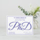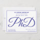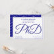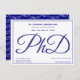 En PhD-studentfest-inbjudan i blått och vitt. Inbjudan har även en mönster i ord PhD, skrivet, på baksidan.