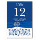 Det romantiska royalet blått och vitt blommigt bröllop-bordsnummer har en bild av ett royal blått och silver-filigree-hjärta ovanpå ett royal blått band som går tvärs över dubbla på kortet med grund på en vit bakgrund längs blåa blommor. Det finns ett royal blått textområde ovanför menyfliksområdet och det har bordsnumret, namnen på bruden och brudgummen och bröllop-datumet i vitt. **DU MÅSTE ÄNDRA NUMRET PÅ KORTET FÖR VARJE NUMMER DU BEHÖVER, LÄGGA TILL DET I KORTET, ÅTERVÄNDA SEDAN OCH UPPREPA PROCESSAA FÖR VARJE NUMMER DU BEHÖVER. Om du behöver ytterligare matchande artiklar skickar du en e-postbegäran till niteowlstudio@gmail.com eller användor Zazzle-chattan för att få kontakt.