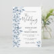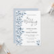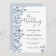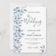 En bröllopsinbjudan till trendiget i vitt och dammblått. En vit chic på framsidan. Dekorerad med botaniska blåa färgader och löv. Modern stor, hanterad text, typografi med texten: bröllop i. Mallar för namn och bröllop. Mörk grått text. Baksida: dammig blå bakgrund.