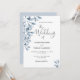 En bröllopsinbjudan till trendiget i vitt och dammblått. En vit chic på framsidan. Dekorerad med botaniska blåa färgader och löv. Modern stor, hanterad text, typografi med texten: bröllop i. Mallar för namn och bröllop. Mörk grått text. Baksida: dammig blå bakgrund.
