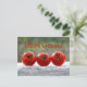 Bleibt Gesund mit drei rote Tomaten auf einer weißen Mauer vor grüner Natur