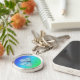 Rund silver-rimmad nyckelkedja med en blå blek-fjäril på en blå och grönt vattenfärgsbakgrund i stil