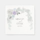 Elegant baby blue, lilac och vit ros omgiven av pärlgrött löv ökar namn och bröllop på dessa pappra blöjor i olika storlekar och i stilar. Välj cocktail, luncheon eller middag storlek och kokt eller icke-kokt stil. Detta är en del av en bröllop-stationär samling med matchande tillbehör till bröllop. Design skapat för BarefootBride™ © by WhimsicalArtwork™