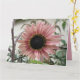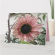 Kortet har snart ett vackert foto av en blek solrosa från rosa. Solrossen är naturligt rosa och petalerna har en blek rosa yttre ring och en mörkare rosa inre ring. Mitten där fröna är svarta. Fotografiet togs i en trädgård.