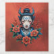Blekens skönhets hemlighet, den vackra japanska flickan. Hennes hår är fäst i en elegant bun och ger henne ett fint utseende. En ljusröd prick är utsuddad på hennes framhuvud och skapar en brännpunkt. Hennes ansikte är hårt utpekat med blått och rött mönster, där hon betonar sin individualitet och kanske också den kulturella symboliken. Hon bär en blå och vit snyggt som harmoniskt matchar färgen på hennes prydnadsföremål.