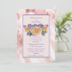 En vacker bröllopsinbjudan med en bakgrund av rosa körsbärsblommor. Den blekt rosa mitten är förstärkt med vackra rosa-gula Fredsrosor och lila färgaccenter.