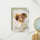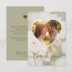 Uttryck din tacksamhet med elegans med detta romantiska tackkort med ett drömlikt foto på en vit ros av Destei, bleknat med en vit överlagring för en tidlös look. Framsidan har en hjärtformad fotoram där du kan lägga till ett anpassat parfoto, tillsammans med ”tack” i graciös skrivstil. Baksidan har en stämningsfull, dovt grön bakgrundsfärg med en subtil hjärtsilhuett, utrymme för ditt tackmeddelande och personlig avslutning med namn. Ett hjärtligt och stilrent sätt att tacka dina gäster.