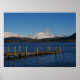 Photo of landing stage and Derwentwater with Blencathra fell covered in fresh snowfall in late autumn, Lake District, Cumbria, England.