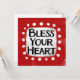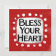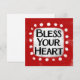 "Bless Your Heart" är en söt textdesign i rött med svart text, tillsammans med en vit accent-form och vita texturerade vita prickar runt den.