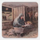 Vintage vycard-bild av Nativitetsscenen med det välsignade Mor, baby Jesus, kor, manger och de tre vises Manar utanför fönstret. Stjärnan lyser i avstånd. Omtryckt som vackra julklistermärken.