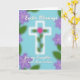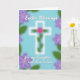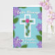 This greeting card features a tall white cross centered on a light sky-blue background, with a green vine curling upward as if gently reaching for someone it cares about 🌷. A single bright pink flower sits where the arms meet, adding a tender focal point that feels like a quiet gesture of affection. Around the edges, soft-focus lavender blossoms and leafy greens create a hazy border that frames the center without pulling attention away. The overall palette stays light and airy, with smooth lighting that keeps the scene calm and springlike. Near the top, a short Easter message appears in white flowing lettering, spaced neatly so it feels balanced above the cross 🐇. Along the bottom, the dedication “for my Daughter and Son-in-law” is placed in a smaller line, also in white, centered and easy to spot. The vine wraps the vertical beam and the pink bloom stands out sharply against the pale blue field, while the lavender blur fades toward the corners.