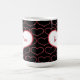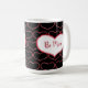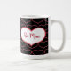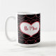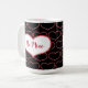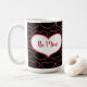 Mugg har en grafik som består av ett rött och vitt hjärta i ett upprepande mönster. På lämnar och höger sidan av mugg finns ett stort vitt hjärta med röd trim. Personligen "Be min" kan vara personlig med ditt eget budskap eller ett namn.
