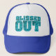Vår blissed Out-Truckerkeps har en blå faux-orakskinn "bling"-effekt och djärv atletisk skrift. Designad för själar i andlig som känner till glädjen i ett öppet liv. Visas på ett royal och en vit sockel - finns i en mängd olika färg.