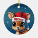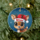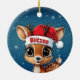 Blitzen! Celebrate the holiday season with this festive round ceramic red ornament featuring an endearing woodland forest animal cartoon graphic of a cute baby reindeer wearing a Santa hat. Perfect deer with antlers for decorating your tree or as a thoughtful gift, this whimsical doe decor makes a cherished keepsake for years to come. Customize by changing the text, the font, the font color, or remove the text. You can even transfer this design onto other products. Enjoy this design your way! 🎄🩌 Dimensions: Diameter: 2.87". Thickness: 0.156". Weight: 1.4 oz. Made of white porcelain. Full-color, full-bleed printing. Printing on both sides. Thread does not come attached/tied.
