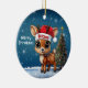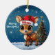 Blitzen! Celebrate the holiday season with this festive round ceramic red ornament featuring an endearing woodland forest animal cartoon graphic of a cute baby reindeer wearing a Santa hat, and Merry Christmas written in white. Perfect deer with antlers for decorating your tree or as a thoughtful gift, this whimsical doe decor makes a cherished keepsake for years to come. Customize by changing the text, the font, the font color, or remove the text. You can even transfer this design onto other products. Enjoy this design your way! Check out ForestBabies Xmas Deer Collection for matching decorations. 🎄🩌 Dimensions: Diameter: 2.87". Thickness: 0.156". Weight: 1.4 oz. Made of white porcelain. Full-color, full-bleed printing. Printing on both sides. Thread does not come attached/tied.