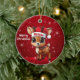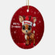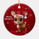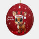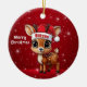 Blitzen! Celebrate the holiday season with this festive round ceramic red ornament featuring an endearing woodland forest animal cartoon graphic of a cute baby reindeer wearing a Santa hat, and Merry Christmas written in white. Perfect deer with antlers for decorating your tree or as a thoughtful gift, this whimsical doe decor makes a cherished keepsake for years to come. Customize by changing the text, the font, the font color, or remove the text. You can even transfer this design onto other products. Enjoy this design your way! Check out ForestBabies Xmas Deer Collection for matching decorations. 🎄🩌 Dimensions: Diameter: 2.87". Thickness: 0.156". Weight: 1.4 oz. Made of white porcelain. Full-color, full-bleed printing. Printing on both sides. Thread does not come attached/tied.