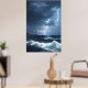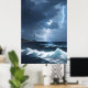 En dramatisk digitalmålning visar ett stormigt sjölandskap med en mörk, grumlig himmel belyst med två ljusa strejkor. Blixten sträcker sig från bildens övre höger hörn och når nedåt mot havet nedanför. Havet är en djup blått, med vita vågar som kraschar mot stranden.