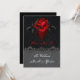 Den mottagningsbara inbjudan har en slående gotisk och romantisk estetik. En framträdande röd ros tar centrum i toppen och droppar en livfull röd vätska på en hjärtformad bakgrund. Den svarta bakgrunden är prydd med ett invecklat damastmönster som förstärker den dramatiska känslan. Under rosen finns en silverliknande dekoration som tillför elegans och delar upp kortet i två sektioner. Den nedre halvan har en grå damastmönstrad bakgrund med sofistikerade designelement i rött och vitt. Den utstrålar charm och mystik samtidigt som den bibehåller en känsla av förfining.