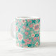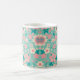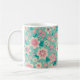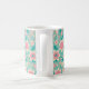 Mugg har en härlig design av rosa blommor i fullt mot en skarp blå bakgrund. Det är ett charmerande sätt att börja din dag eller njuta av en avslappnande kopp av te.